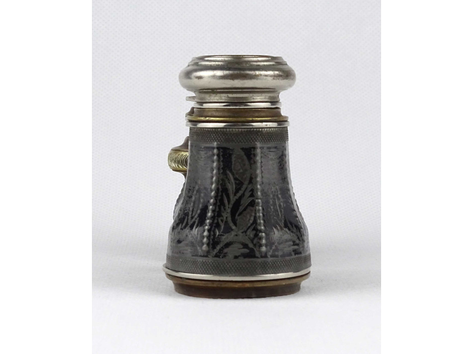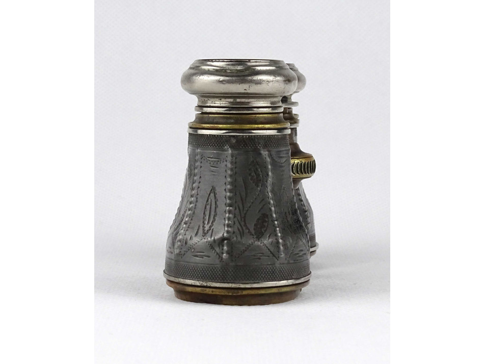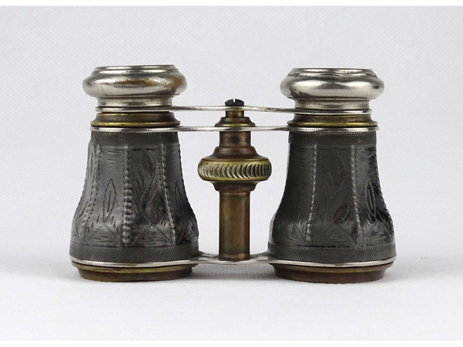 Antik, réz testű, díszes, domborított, ón lemezzel borított távcső, színházi látcső. Lencséi épek, felülete kopottas, patinás.