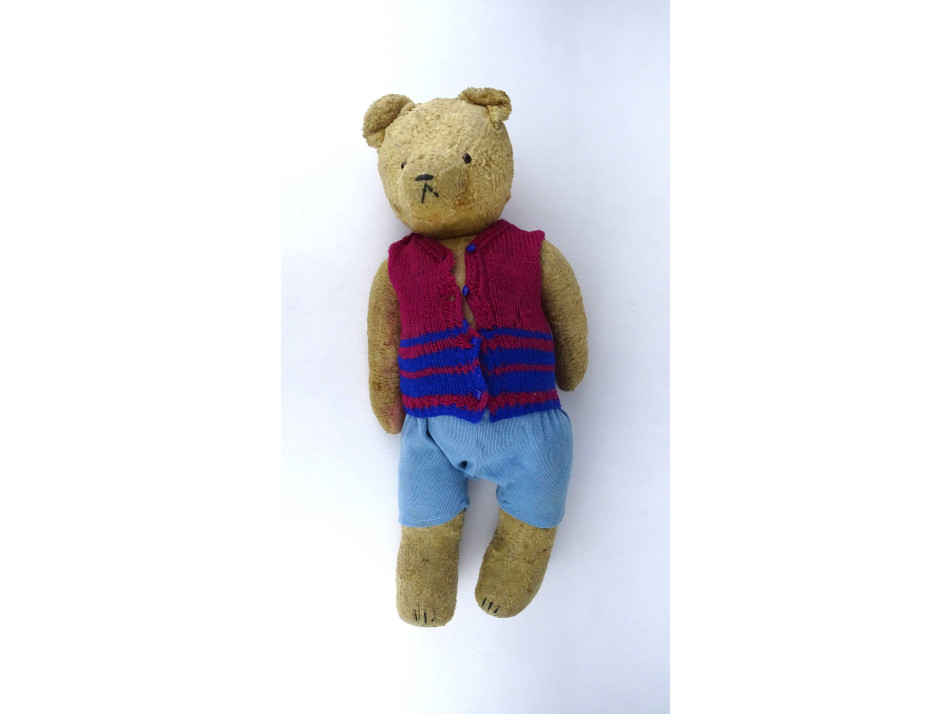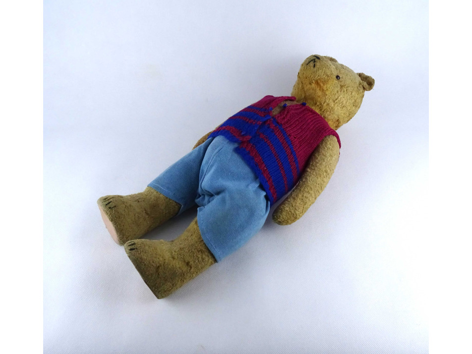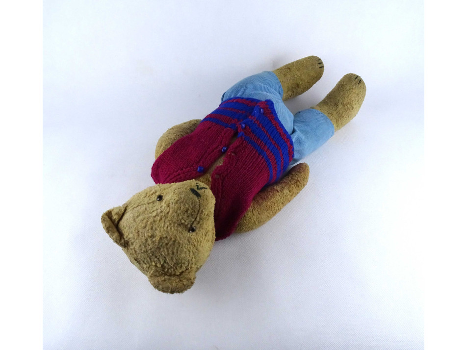 Nagyon régi, felöltöztetett füles mackó, szalmás mackó. A maci két karja, lábai és feje mozgatható, forgatható, szeme üveg.