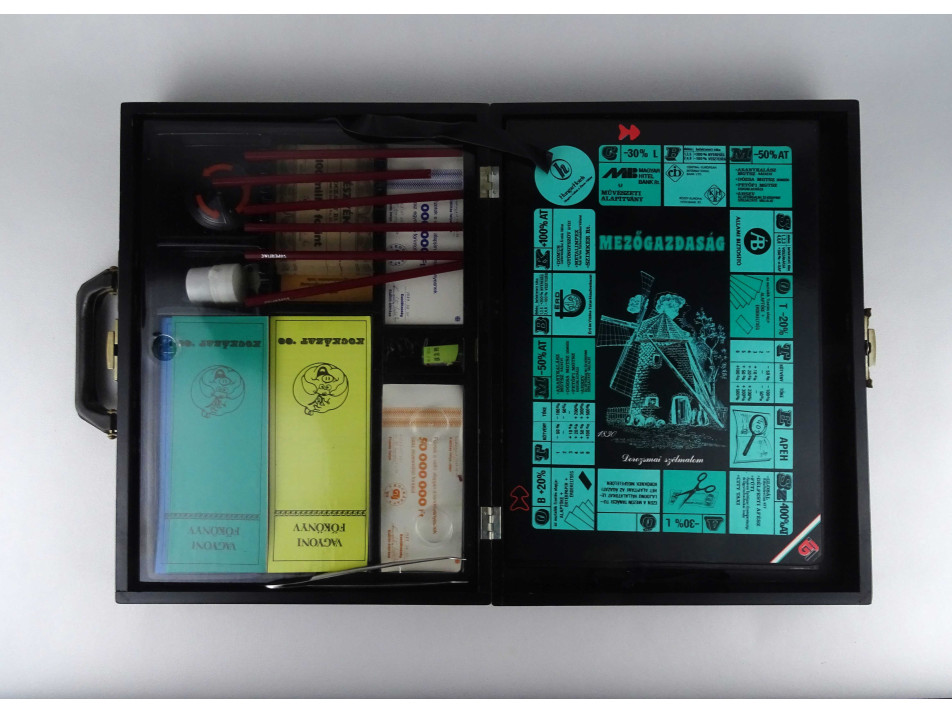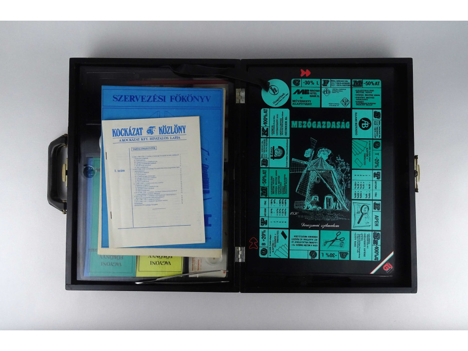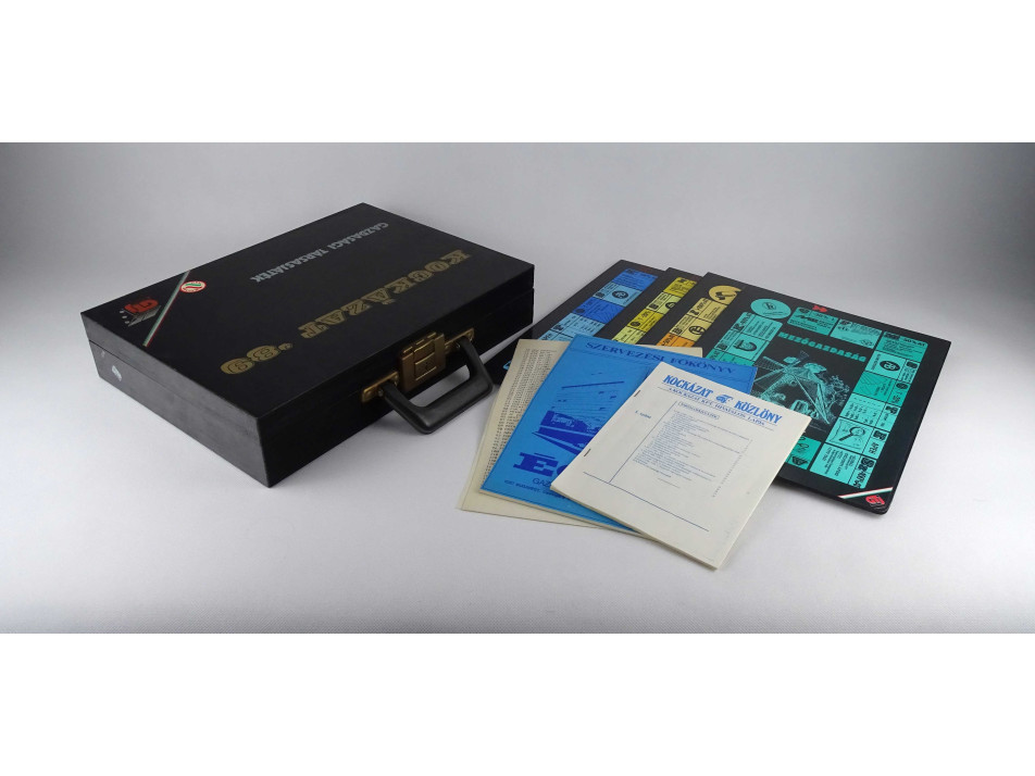 A rendszerváltás idején kiadott gazdasági társasjáték komplett hiánytalan állapotban. Komoly jogi nyelvezettel megfogalmazott szabályrendszerrel és játékszisztémával. Nagyon komoly gyerekeknek, inkább felnőtteknek készült játék, eredeti fa táskában található első és egyetlen kiadás.
