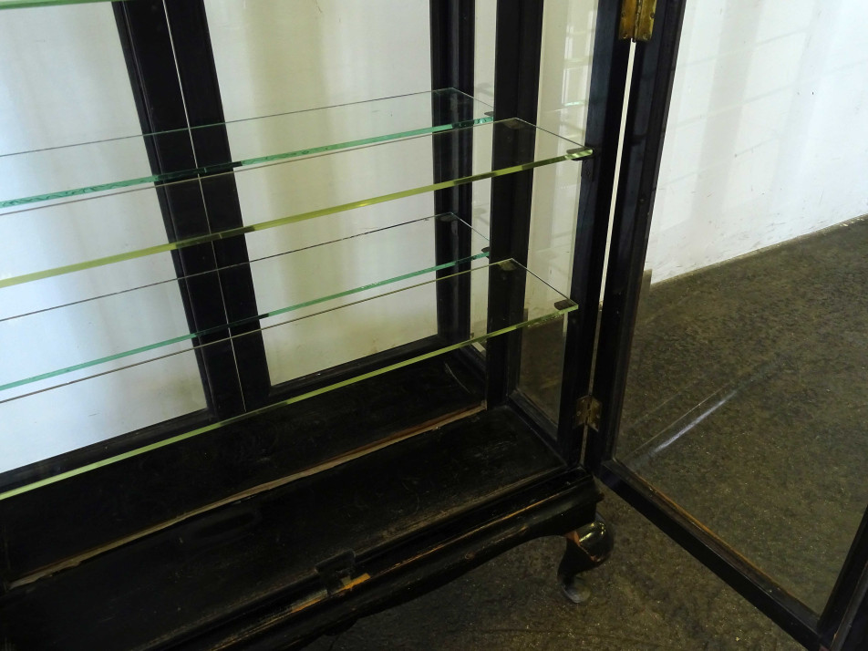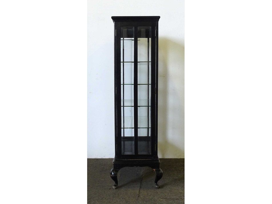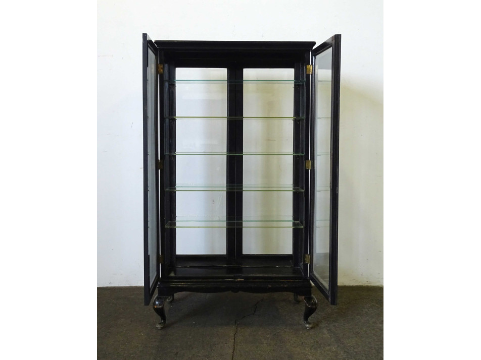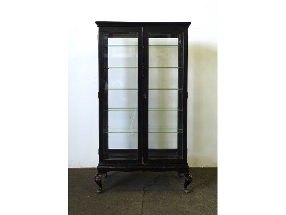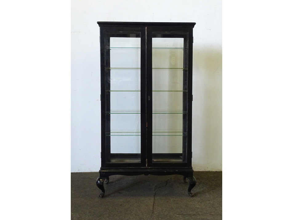 Antik, üvegajtós, üvegpolcos, mindkét oldalról nyitható, fekete színű gyógyszertári vitrin, patika bútor. Ajtajaiban és oldalsó üvegeiben metszett üvegtáblák találhatók. Az egyik üvegpolca hiányzik, de ez könnyen pótolható.