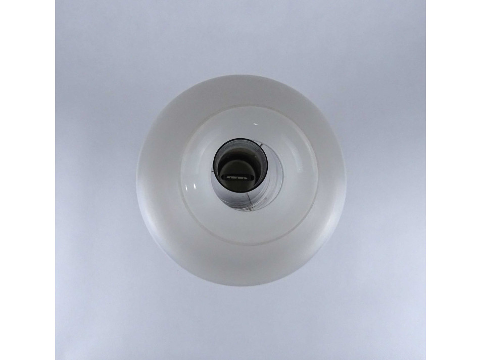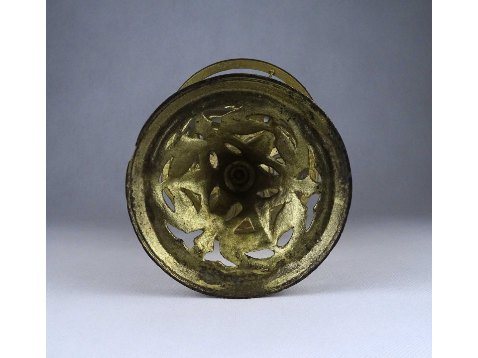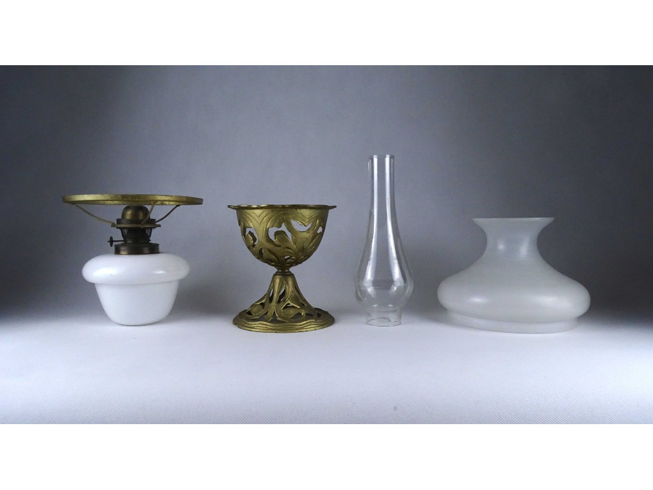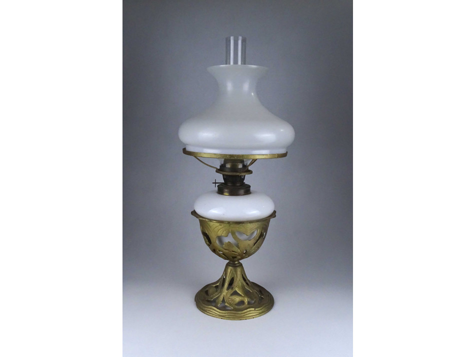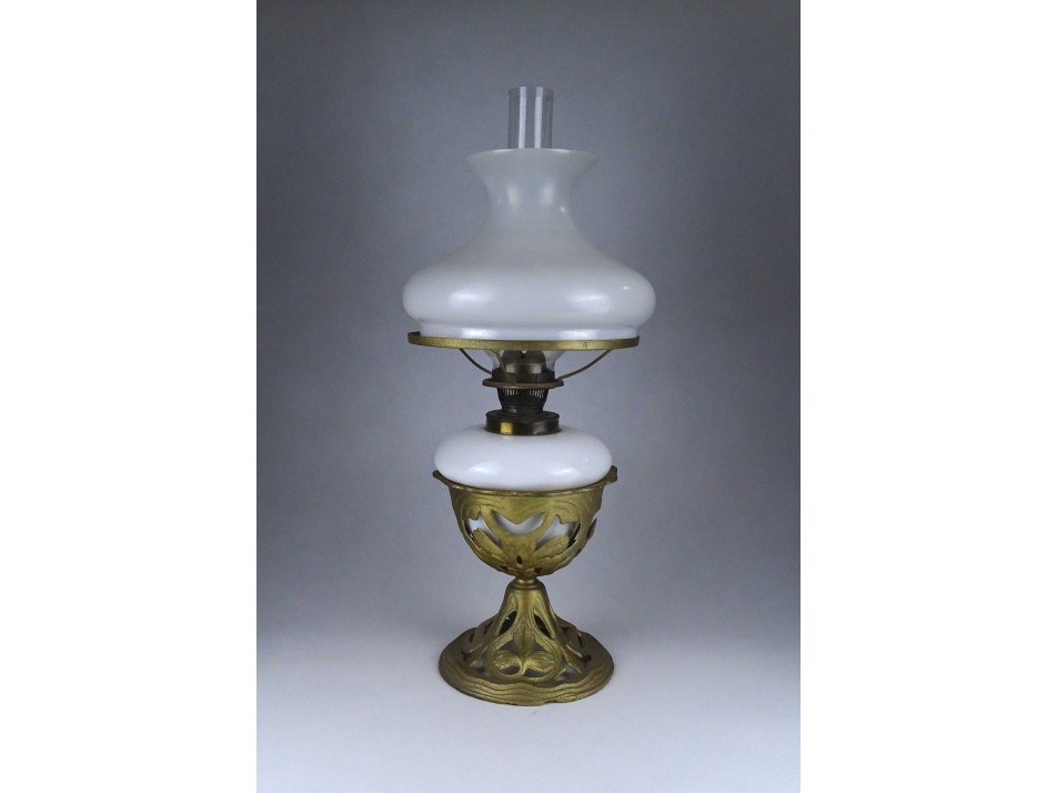 Antik, hibátlan állapotú, szecessziós motívumokkal díszített, arany színűre festett öntöttvas talpon álló, fehér üveg testű petróleumlámpa, 20 cm átmérőjű tejüveg búrával és hibátlan cilinderrel.