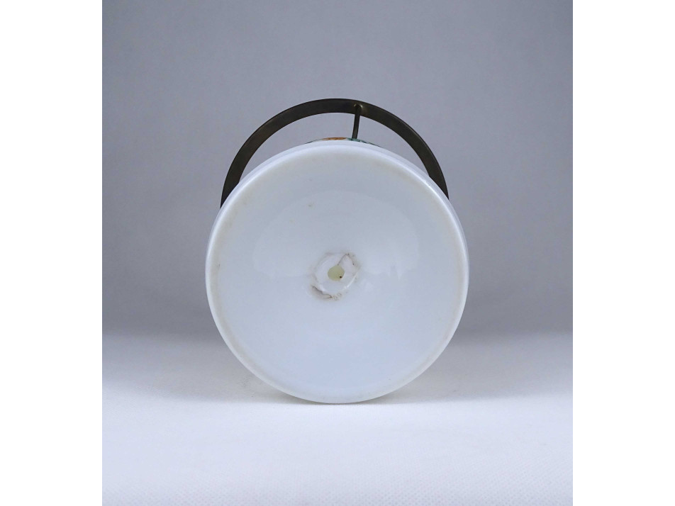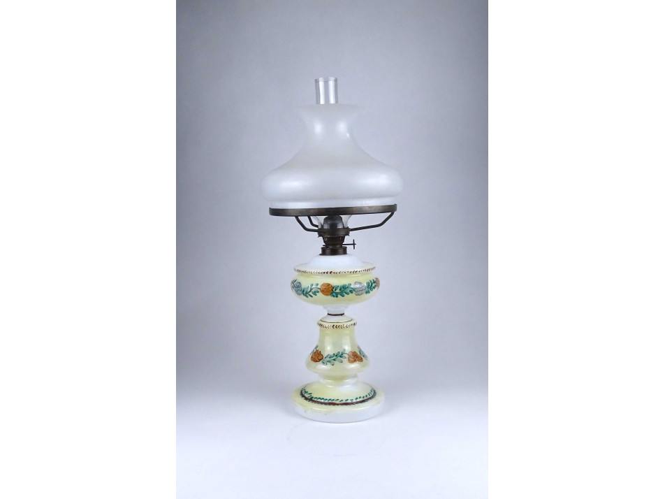 Antik, hibátlan állapotú, üveg petróleum lámpa, kézzel festett virágdíszítéssel, 20.5 cm átmérőjű tejüveg búrával, hibátlan cilinderrel.