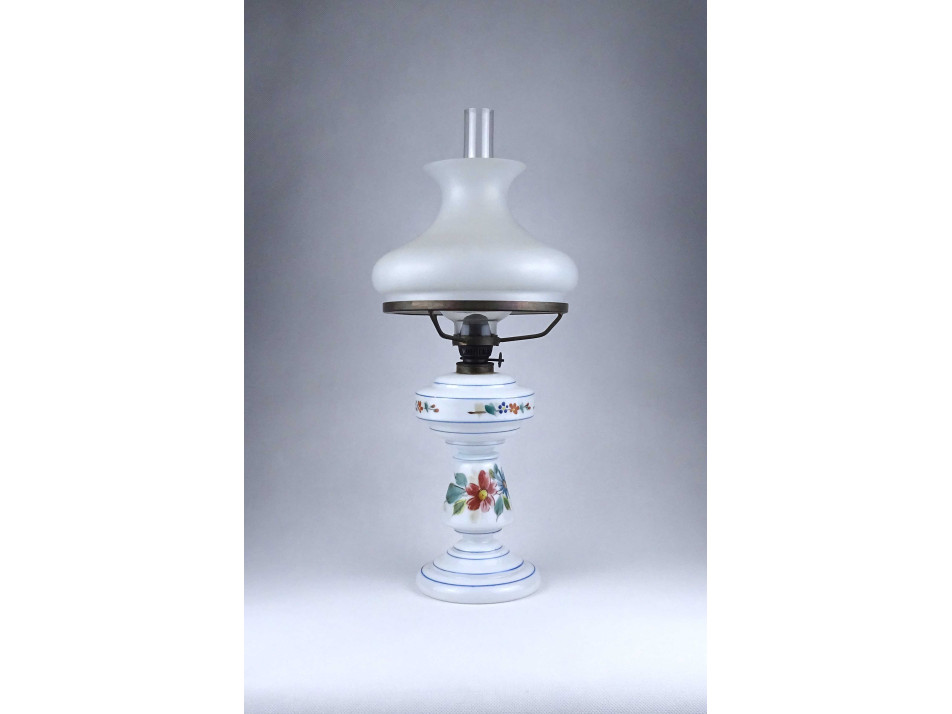 Antik, hibátlan állapotú, üveg petróleumlámpa, kézzel festett virágdíszítéssel, 20 cm átmérőjű tejüveg búrával, hibátlan cilinderrel.