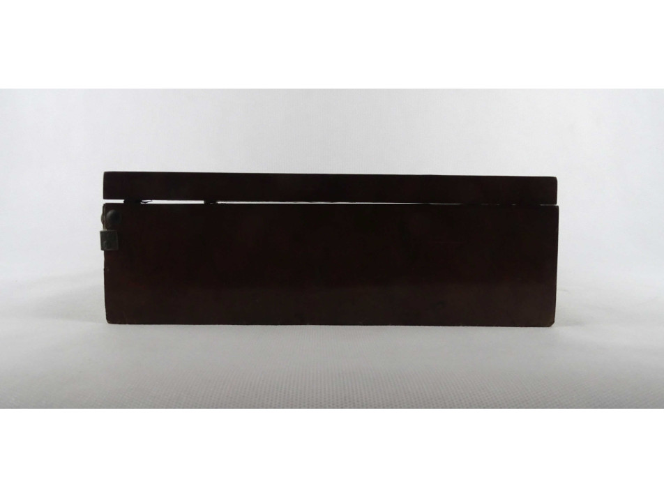 Régi, szép állapotú, fadoboz. Tetejét egy női aktot ábrázoló furnér intarzia díszíti. Belseje