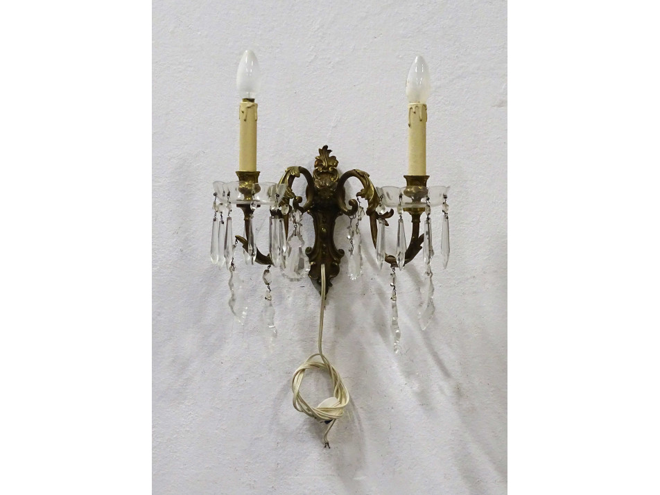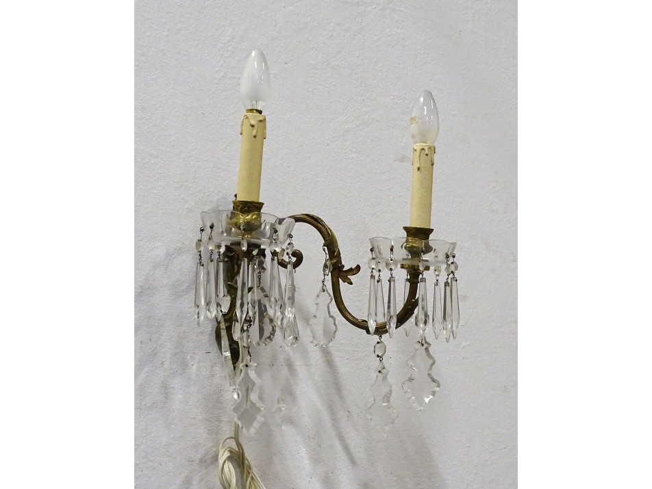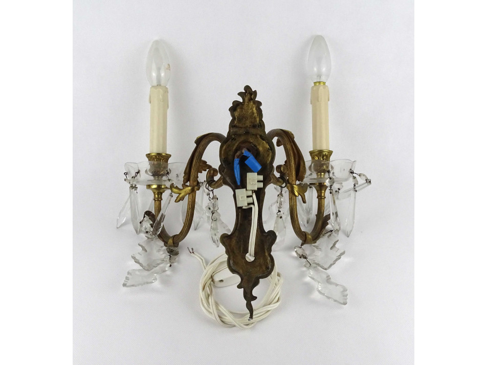 Antik, kétágú falikar kristály függőkkel díszítve. A karok papírmasé gyertyákban végződnek. Kisméretű (E14) izzó való bele. Hiánytalan állapotú, minden függője megvan. A vezetéke mindenképp cserére szorul, jelen állapotában nem lehet a hálózatba dugni, így kipróbálva sem lett.
