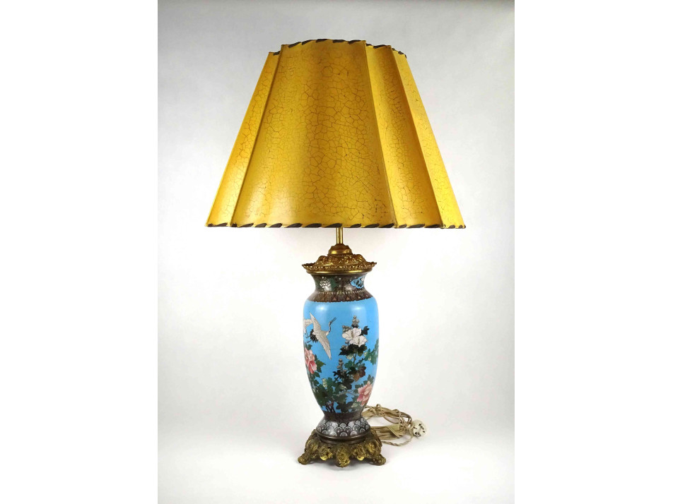 Régi, hatalmas méretű tűzzománc, rekeszzománc lámpa, asztali lámpa, teljesen ép sárga papír burával. Áttört bronz talapzaton álló, aprólékos kidolgozású darvas, pillangós és virágos díszítésű kelti zománc munka. A lámpa teste sárgarézből készült háromégős, nagyméretű (E27) porcelán foglalatos. Földelt dugajjal rendelkezik, működő állapotban van.