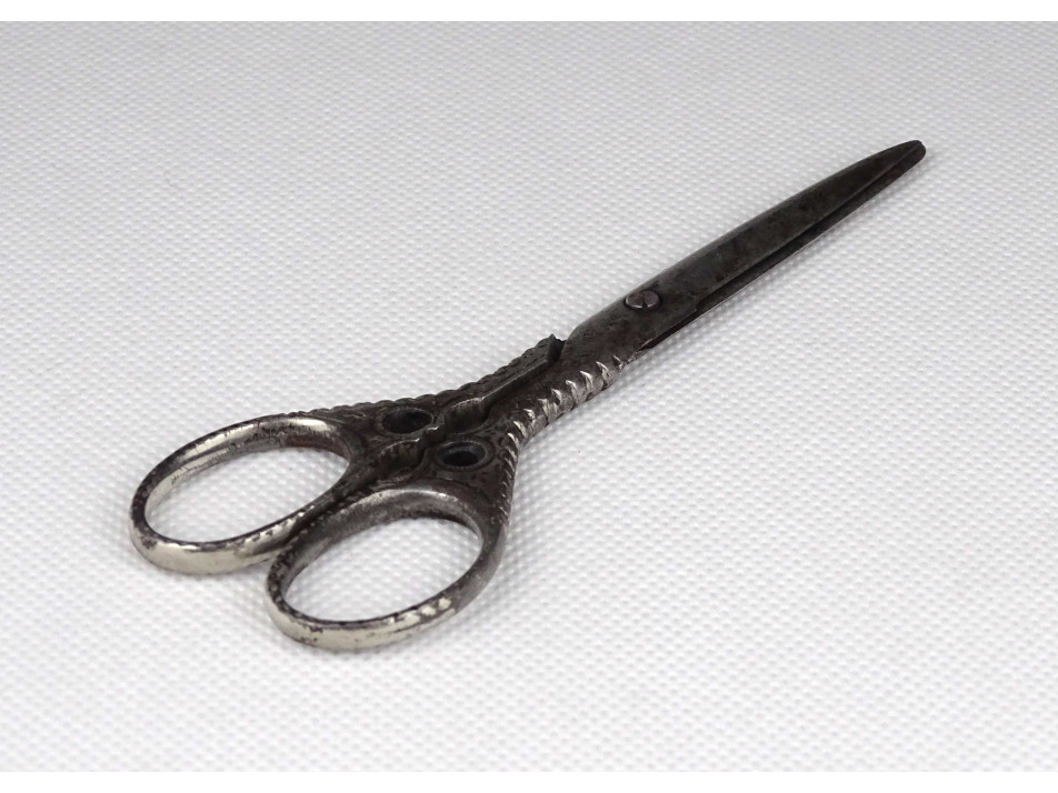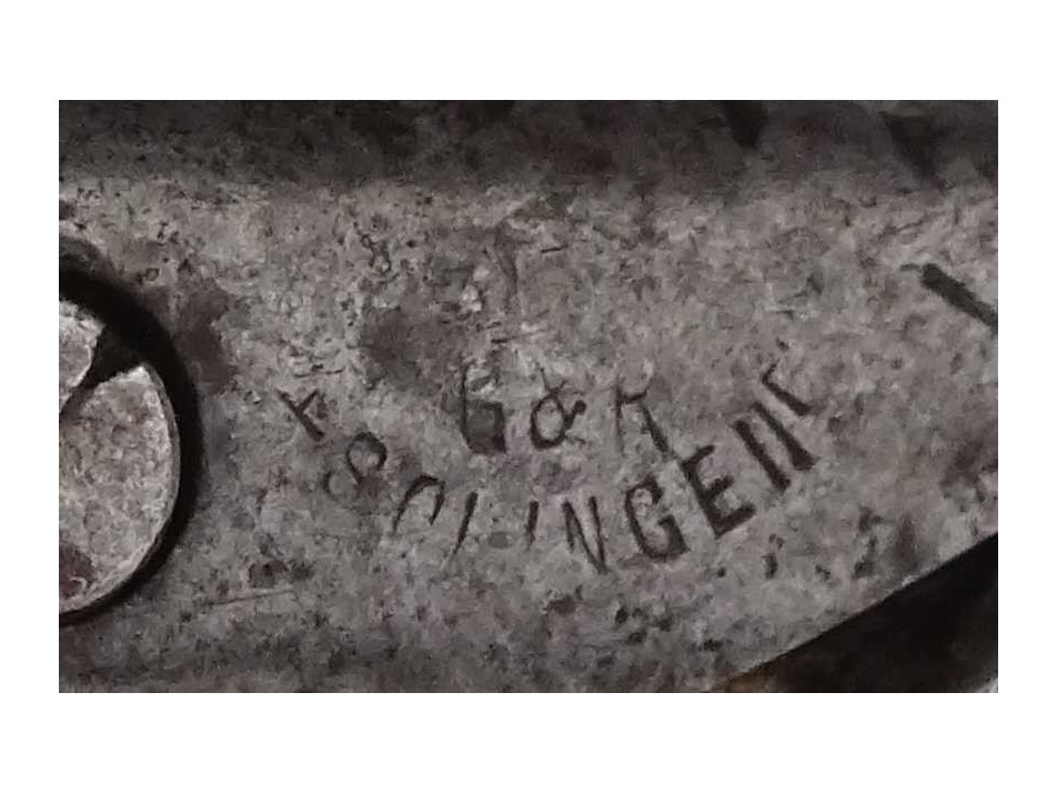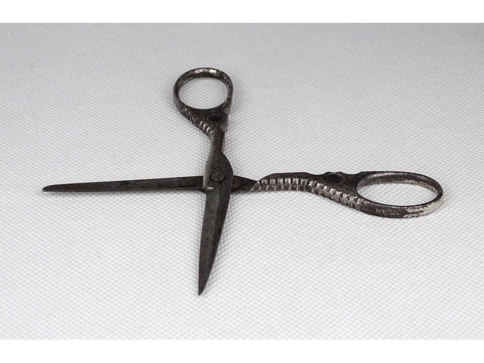 Antik, szép állapotban megmaradt, díszes kivitelű, jelzett solingeni apácaolló. Az olló fogó felöli részén középen egy díszes kereszt látható.