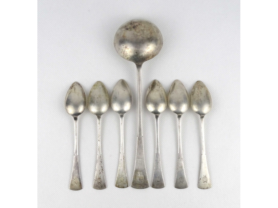 Antik monogramos 800-as ezüst kiskanál készlet és merőkanál dobozban 7 db 208 g