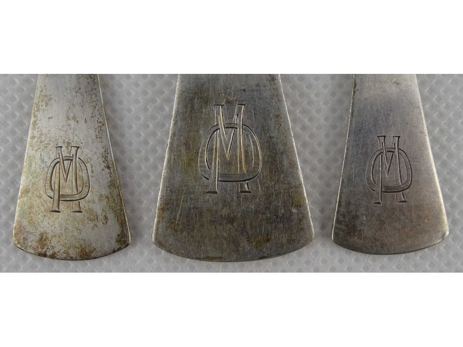Antik, 800-as finomságú, monogramos hat darabos ezüst kis kanál készlet, és merőkanál pamut béléses díszdobozban. Rajtuk jobbra néző 3-as Dianna fejes 800-as finomságjelzés. A kiskanalakon SZN mesterjegy, a merőkanálon WT mesterjegy látható.