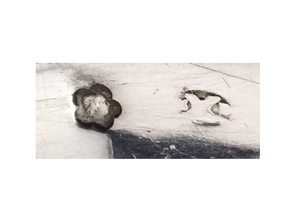 Antik, 800-as finomságú, nagyméretű, kör alakú, magasfalú, bordázott ezüst tál, gyümölcstál, asztalközép. Rajta az 1937-ig használt, jobbra néző 3-as, A betűs Diána fejes, 800-as finomság jelzés, mellette elmosódott mesterjegy látható.
