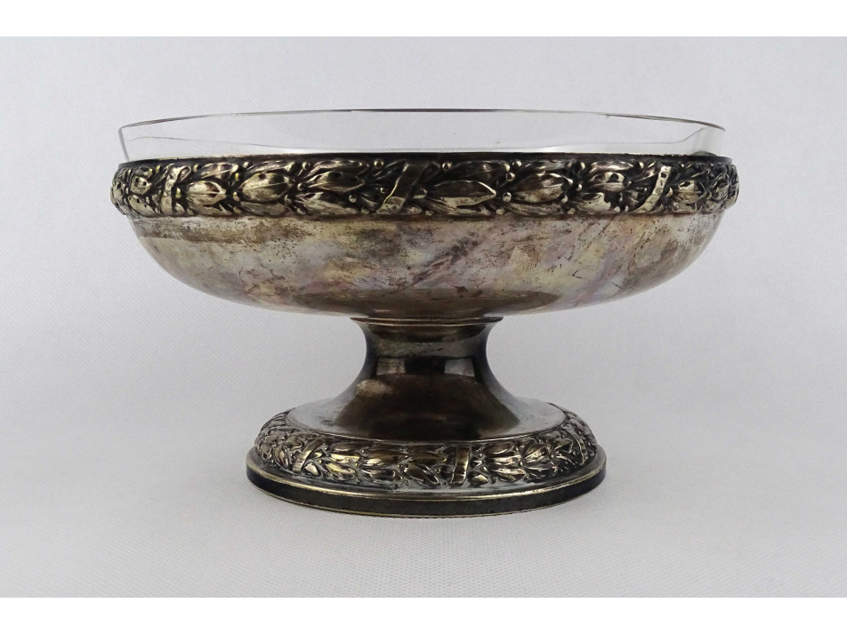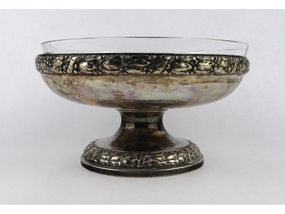 Antik, jelzett, üvegbetétes, ezüstözött fém, körben virágfüzérrel díszített gyümölcskínáló tál, asztalközép.