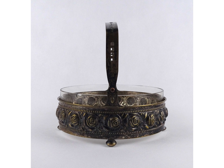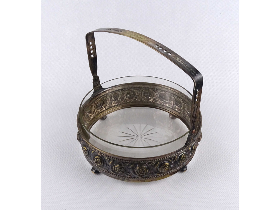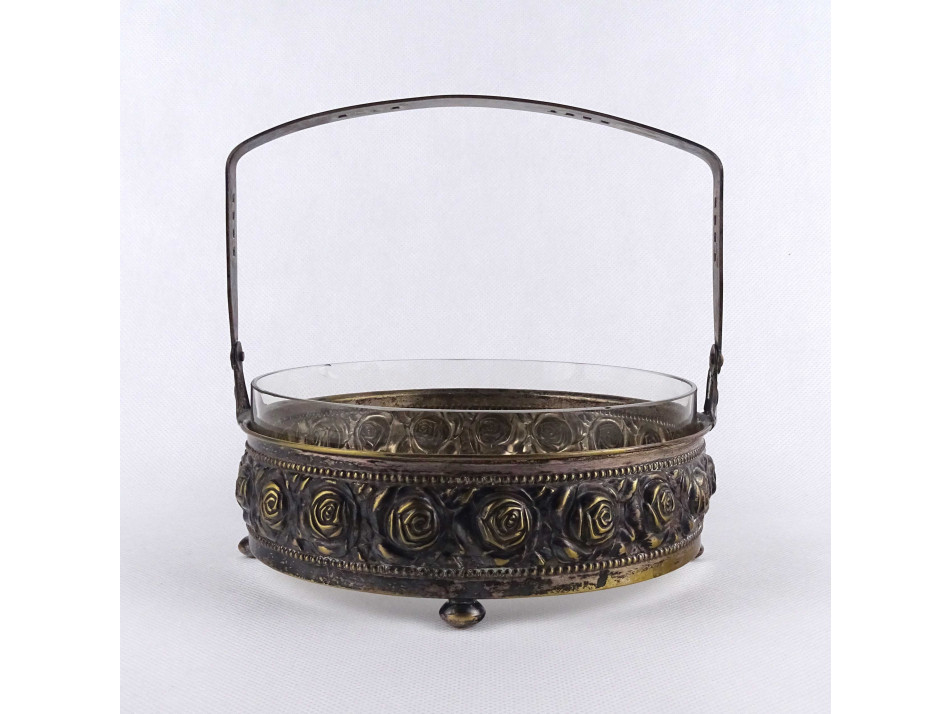 Régi ezüstözött üvegbetétes bécsi rózsás réz osztrák kínáló kosár