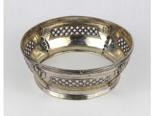 Antik, jelzett 800-as finomságú ezüst kínáló kosár, kistál, hibátlan állapotú üvegbetéttel. Peremén beütve megtalálható a 1937 előtti és a 1937 utáni 3-as Diána fős 800-as finomságjel is, valamint egy erősen kopott olvashatatlan mesterjel. A tál talpán és fülein egy - egy 3-as agár fejes jelzés látható. Oldalára koronás GE monogramot véstek.