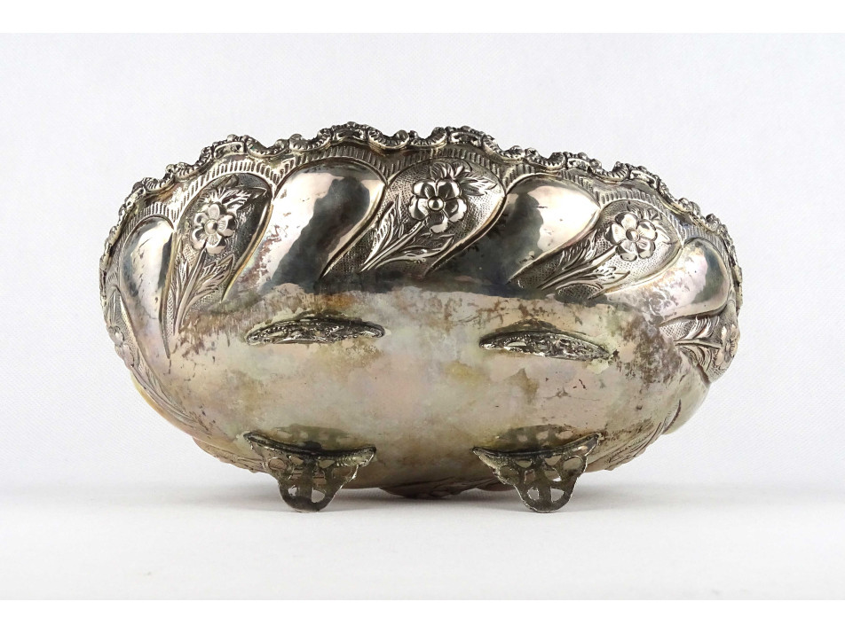 Antik, négy lábon álló, cizellált, domborított virágdíszes, 800-as finomságú ezüst asztali kínáló tál, asztalközép. Alján felülről beütött, erősen kopott 800-as finomságú ezüst jelzés, mellette mesterjegy, lásd fotó.