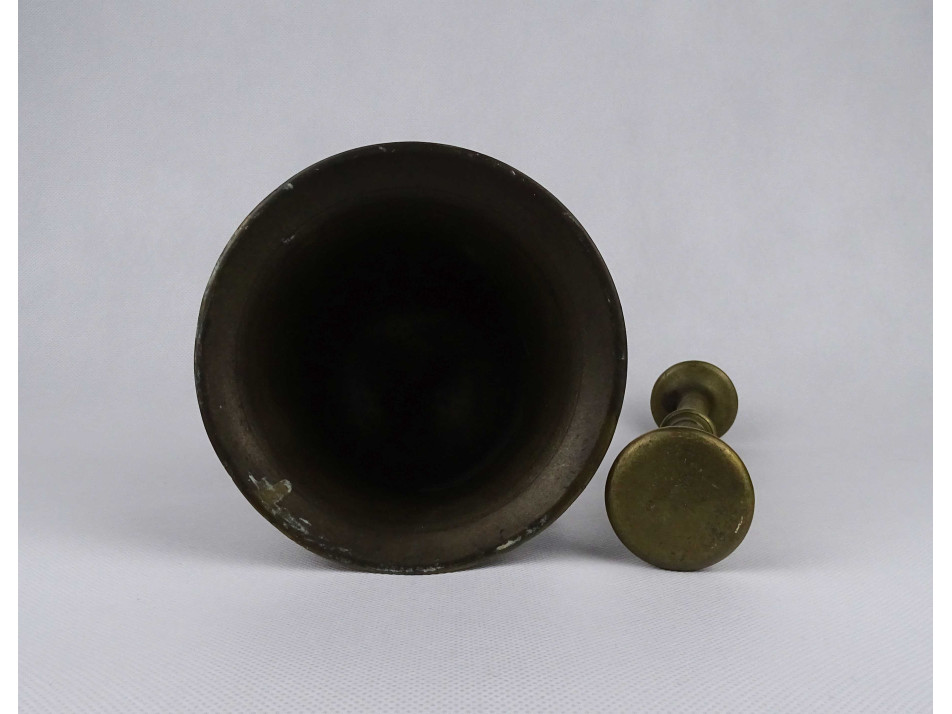 Antik, szögletes fülű, szép állapotú közepesen nagy méretű réz mozsár törővel.