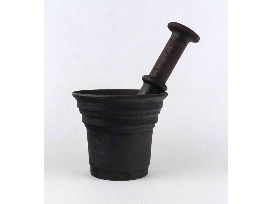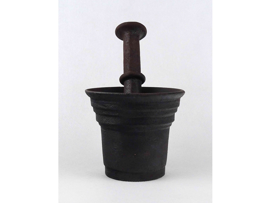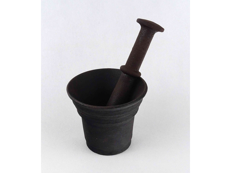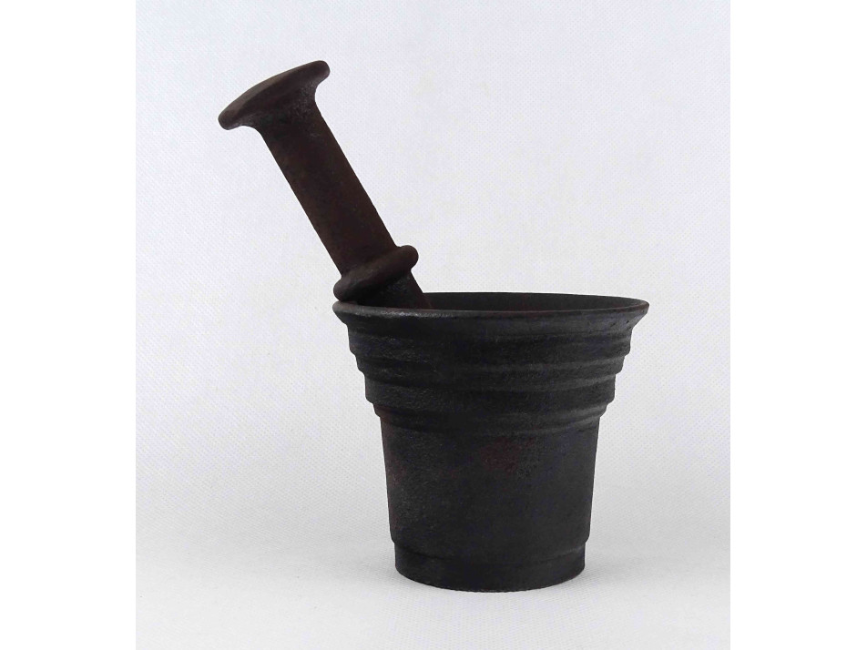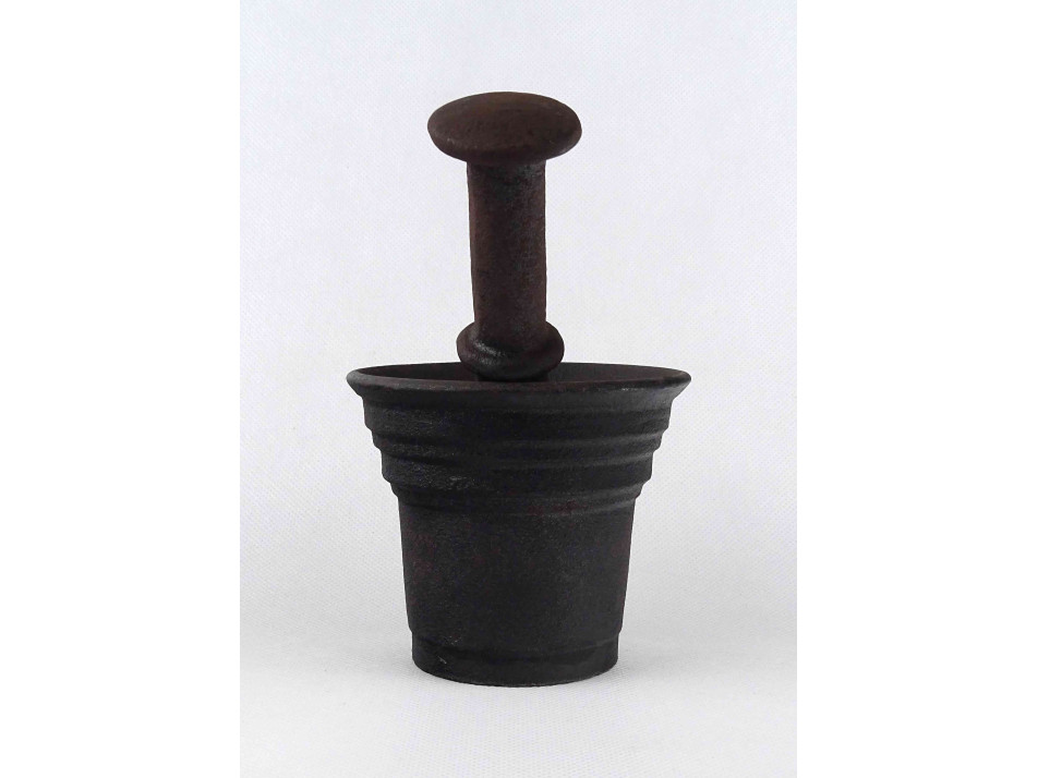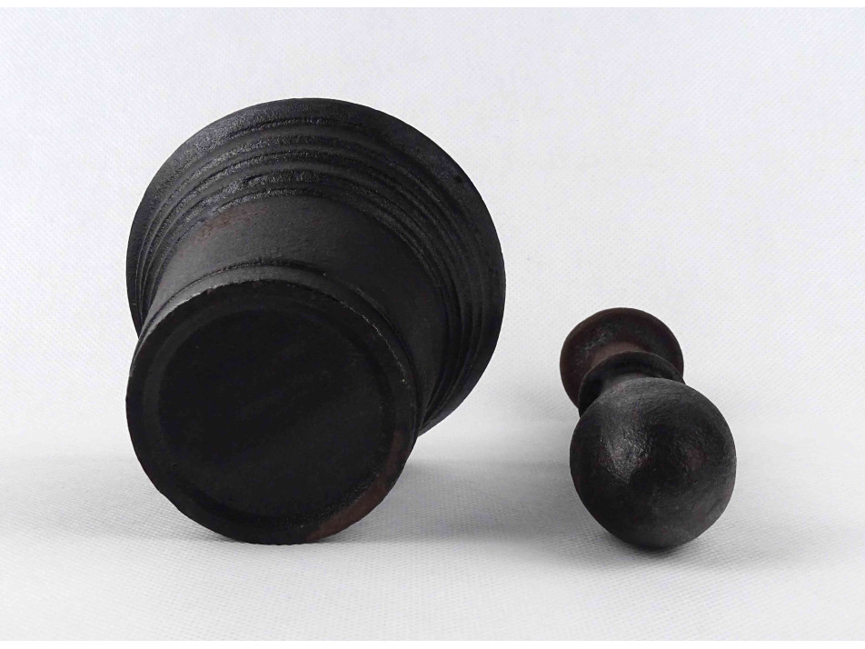 Antik, öntöttvasból készült, különleges fületlen mozsár, vas mozsár, ugyancsak különleges alakú aszimmetrikus törővel.