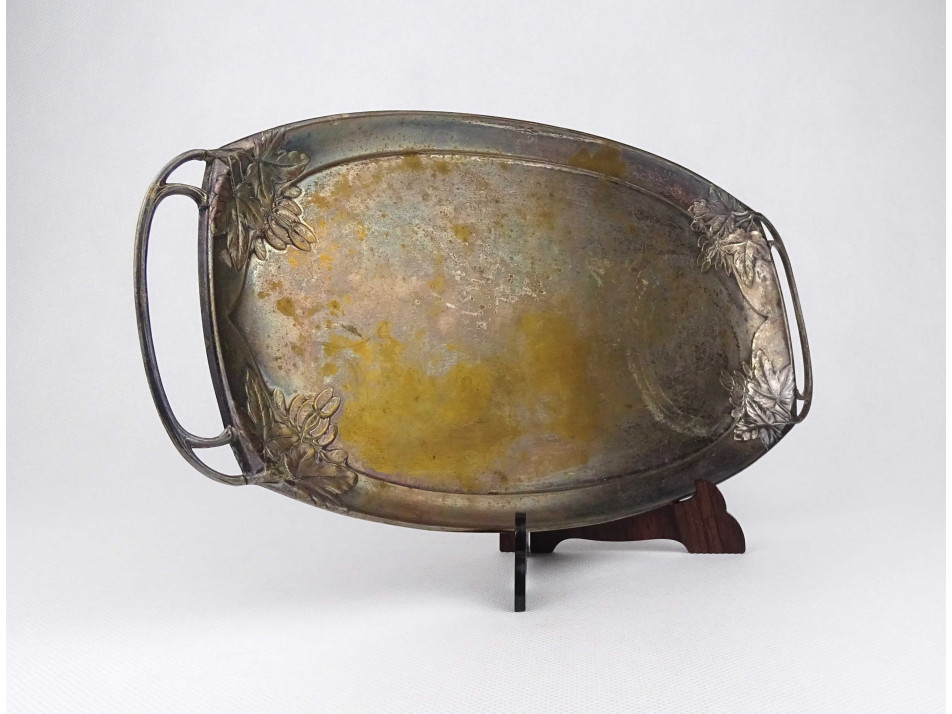 Antik, jelzett, századeleji ezüstözött WMF réz tálca, plasztikus szecessziós díszítéssel. Rajta kopottas ezüstözés.