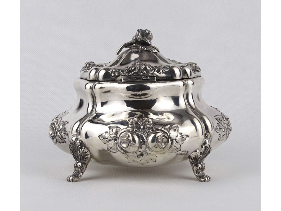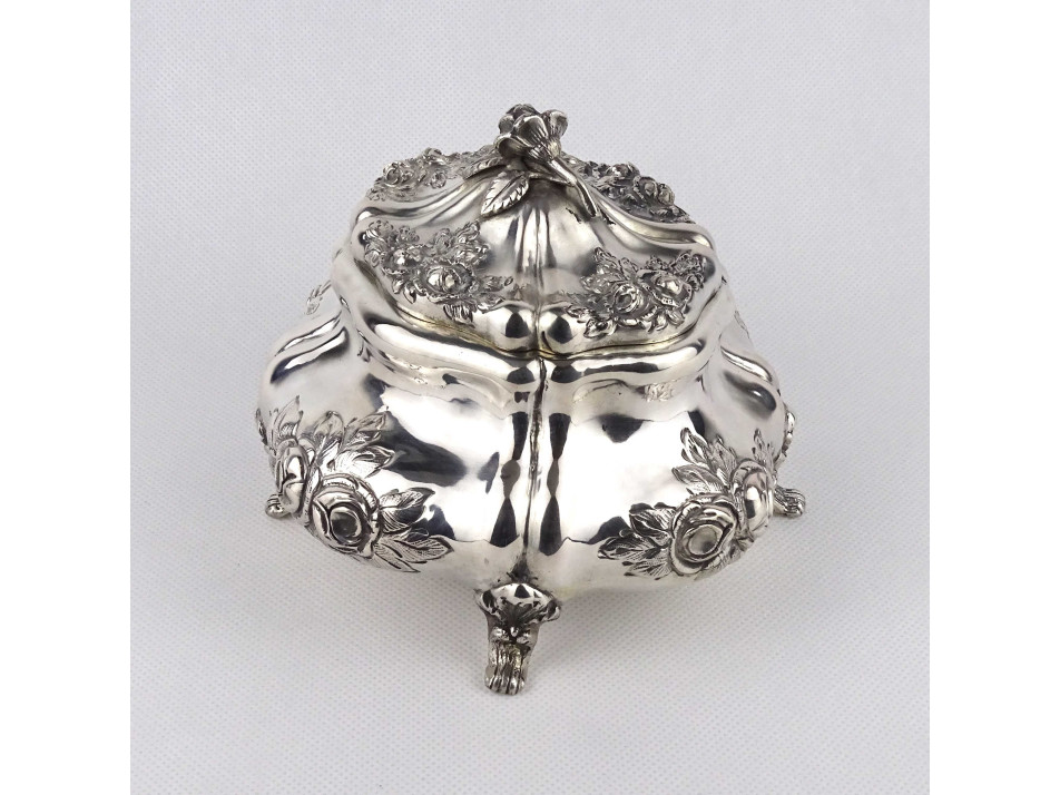 Régi, 800-as finomságú, nagyméretű, négy lábon álló, bordázott mintájú, domborított rózsákkal díszített, rózsafogantyús ezüst cukordoboz, fedeles bonbonier, gyönyörű, felpolírozott állapotban. Rajta 1937-től használt, jobbra néző 3-as Diána fejes, 800-as finomság jelzés, mellette " HJ " mesterjegy látható.