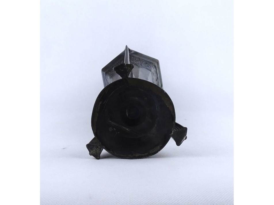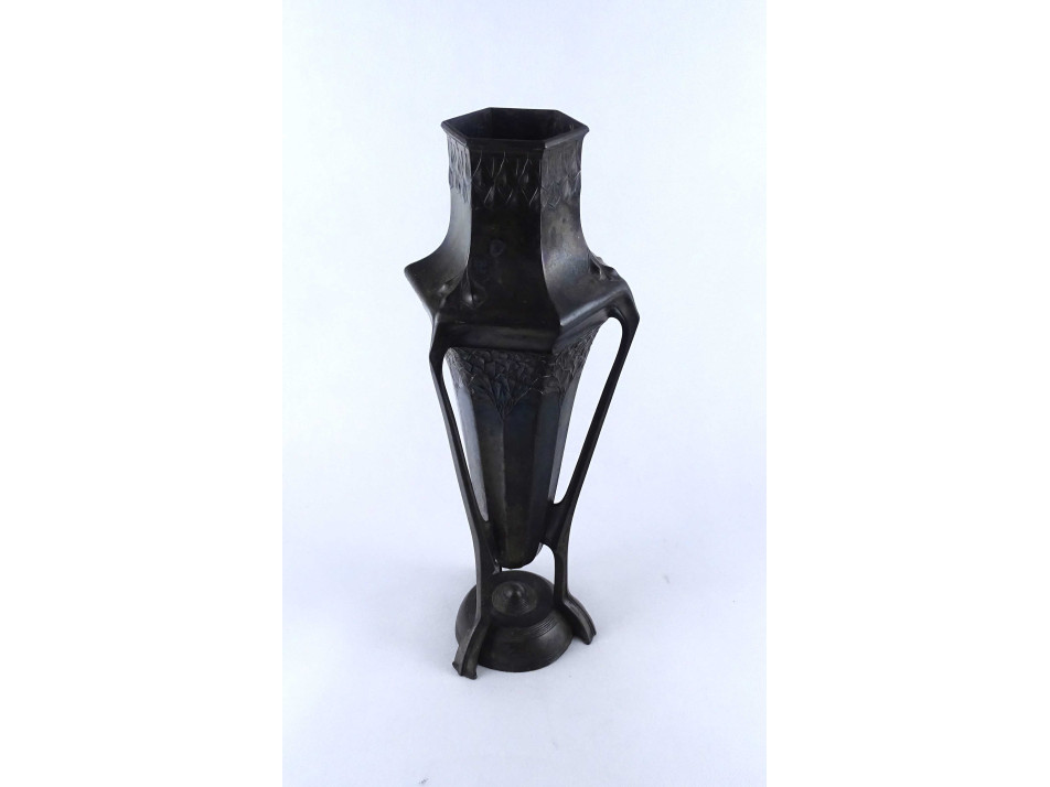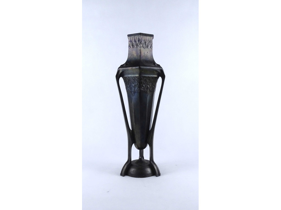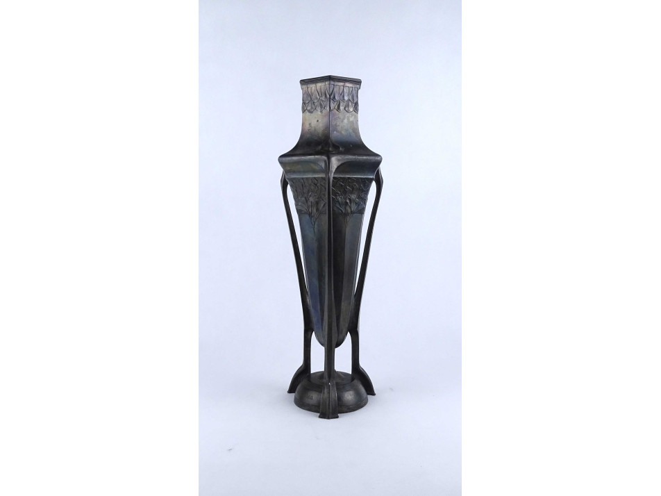 Antik, nagyméretű, hibátlan állapotú, különleges szecessziós forma, három lábon álló ezüstözött ón váza, urnaváza.