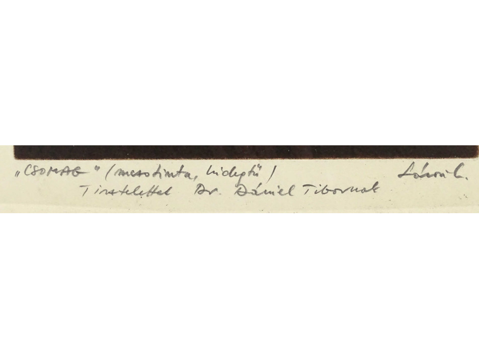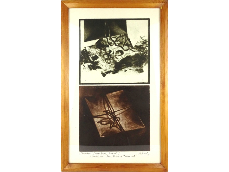 Két grafika egy keretben, üveglap mögött, ajándékozási szöveggel. Egy mezzotinto, vagy borzolásos és egy hidegtű technikával készült grafika, vékony fenyő keretben. Olvashatatlan jelzés jobbra lent, lásd fotó.