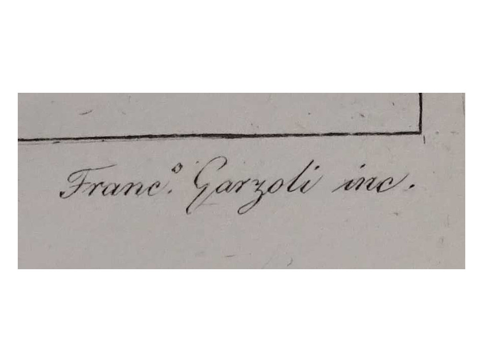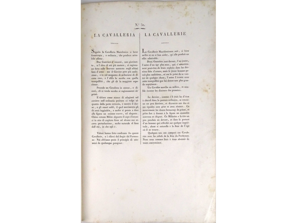 Antik, mártott papíron található, görög lovas és gyalogos katonákat ábrázoló nyomatok. Mellettük olasz és francia nyelvűszöveg.