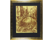 Olaj farost festmény, üveglap mögött, kopottas barna keretben.