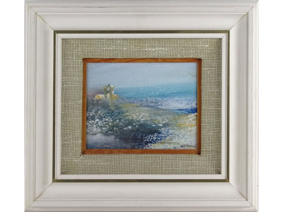 Tempera vegyes technika festmény fehér keretben. Akasztási lehetőséggel rendelkezik.