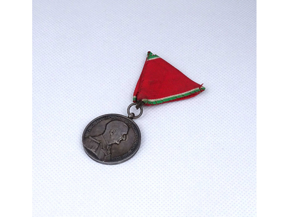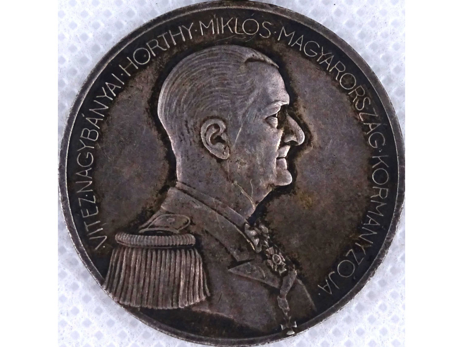 Antik, szép állapotú Horthy Kisezüst Vitézségi Érem. Kétoldalas, jelzett, ezüstözött hadifém érdemérem, katonai kitüntetés. Az érem előlapján a Kormányzó jobb profilt mutató egyenruhás mellképe látható. A körirat: "VITÉZ NAGYBÁNYAI HORTHY MIKLÓS MAGYARORSZÁG KORMÁNYZÓJA". A mellkép alatt BERÁN L. mesterjegy olvasható.