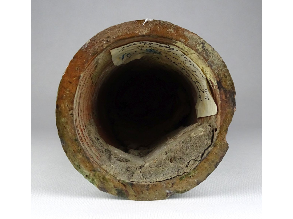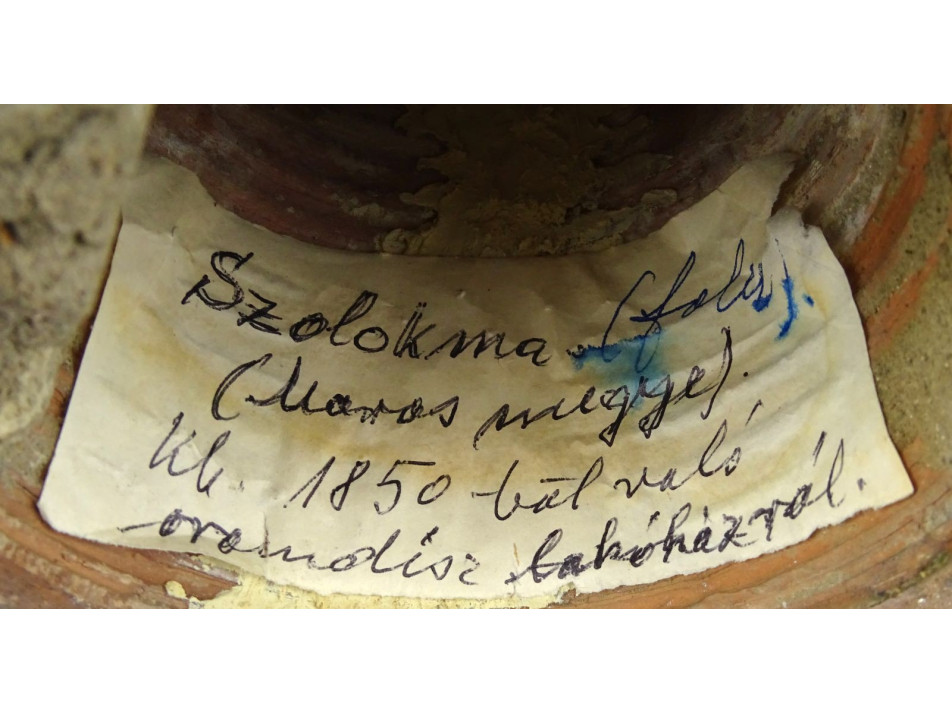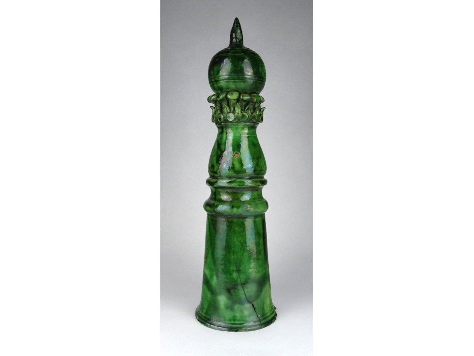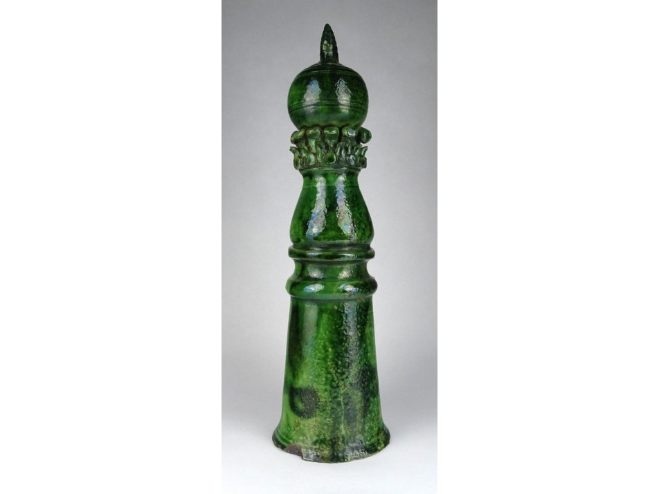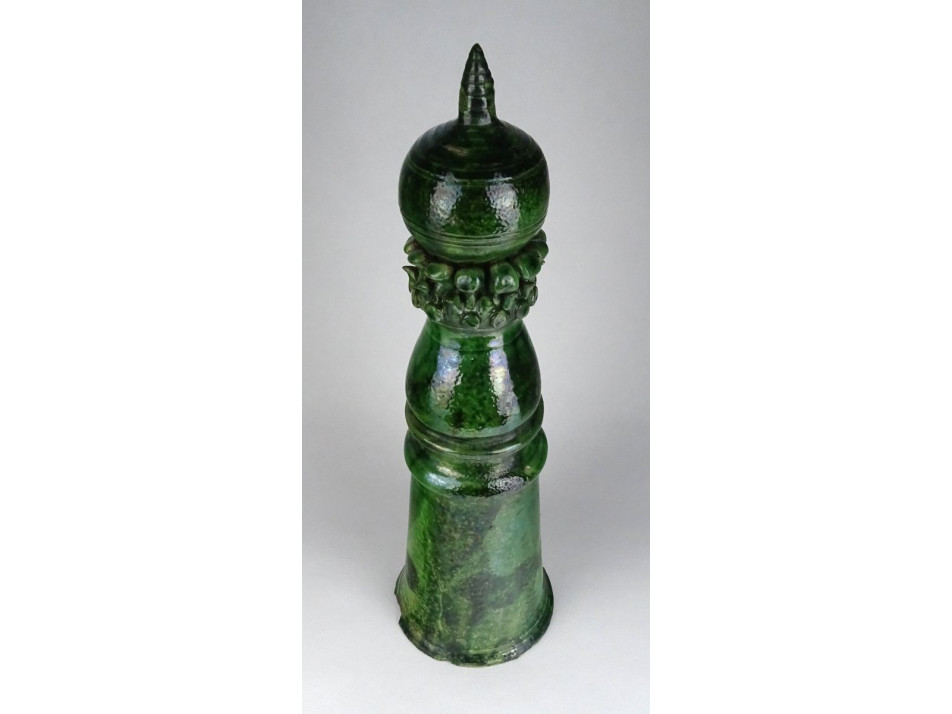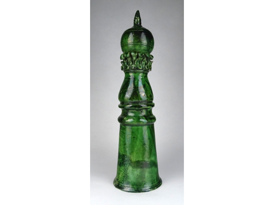 Gyönyörű XIX. századi zöld mázas székelyföldi épület oromdísz. Sakkfigura jellegű égetett zöld mázas cserép kúpdísz. Belsejében gyűjtőtől származó feljegyzés, címke: