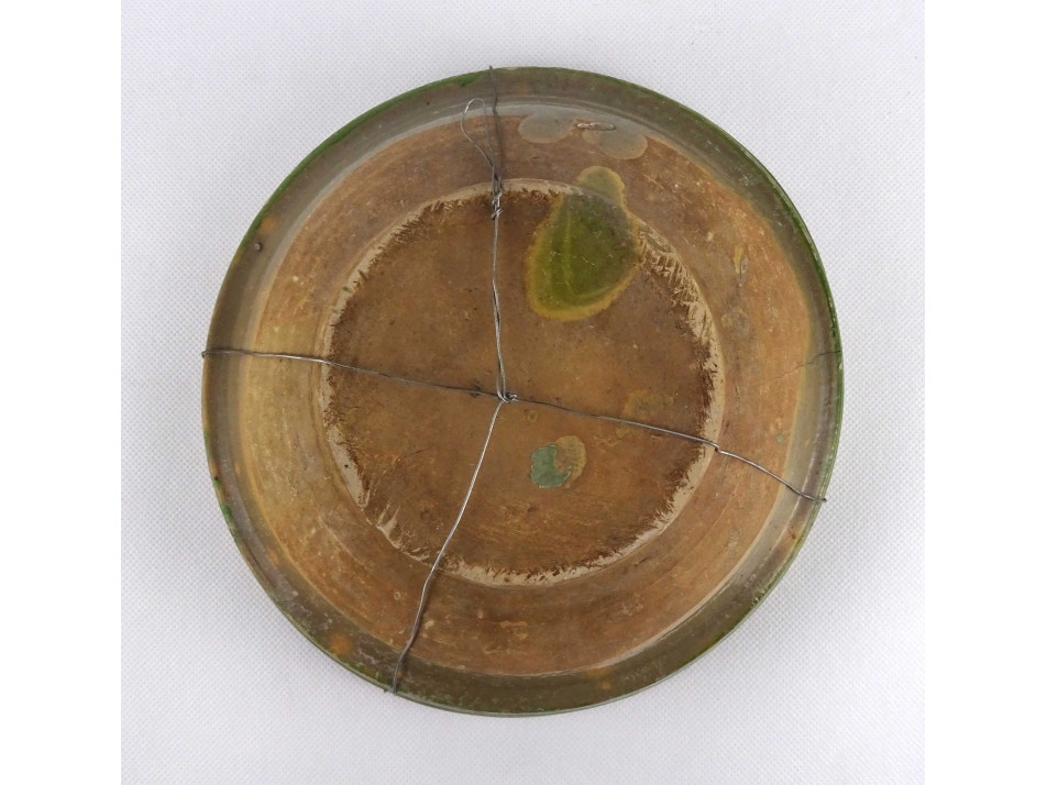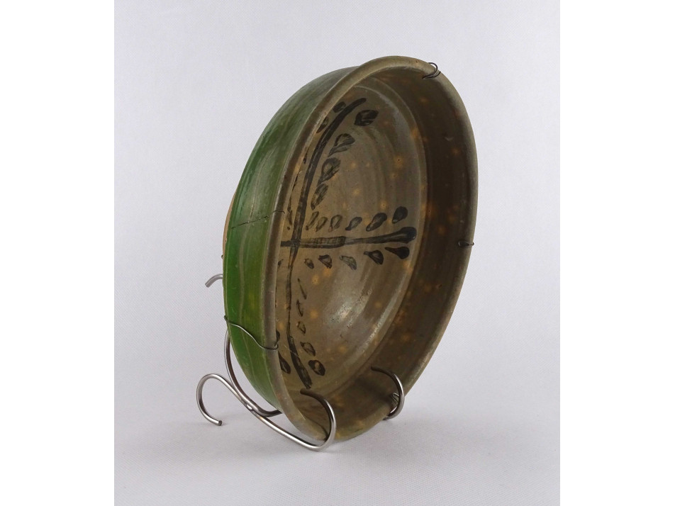 Antik, szép állapotú zöld mázas cseréptál, falra akasztási lehetőséggel. A tálon repedés látható.