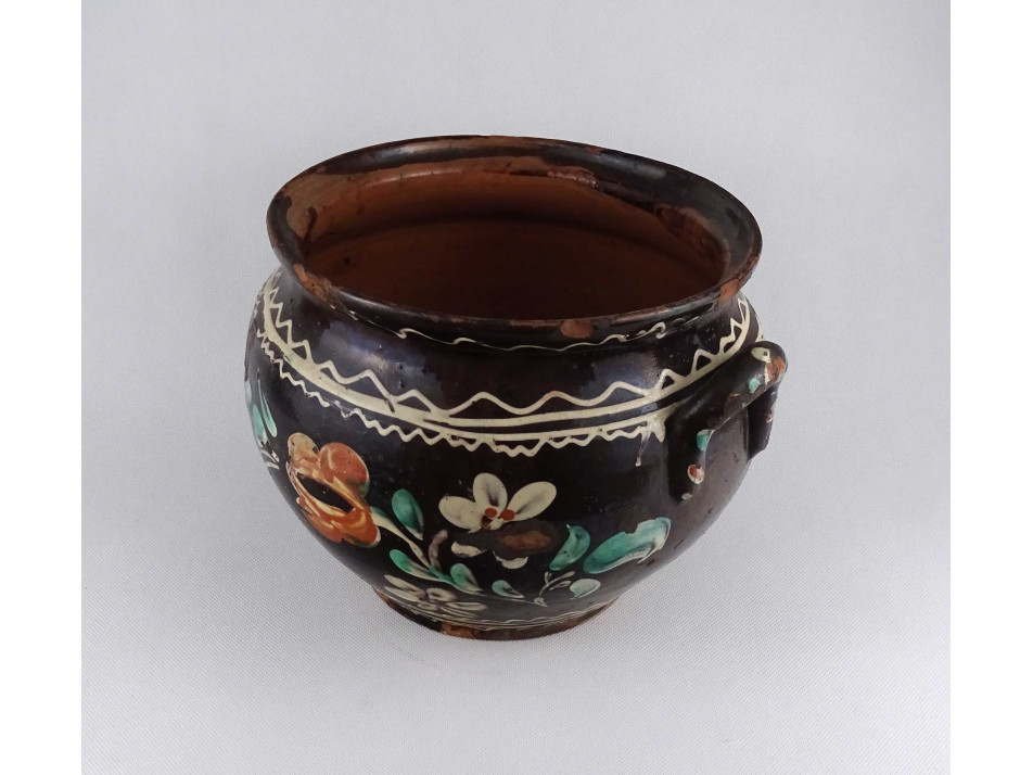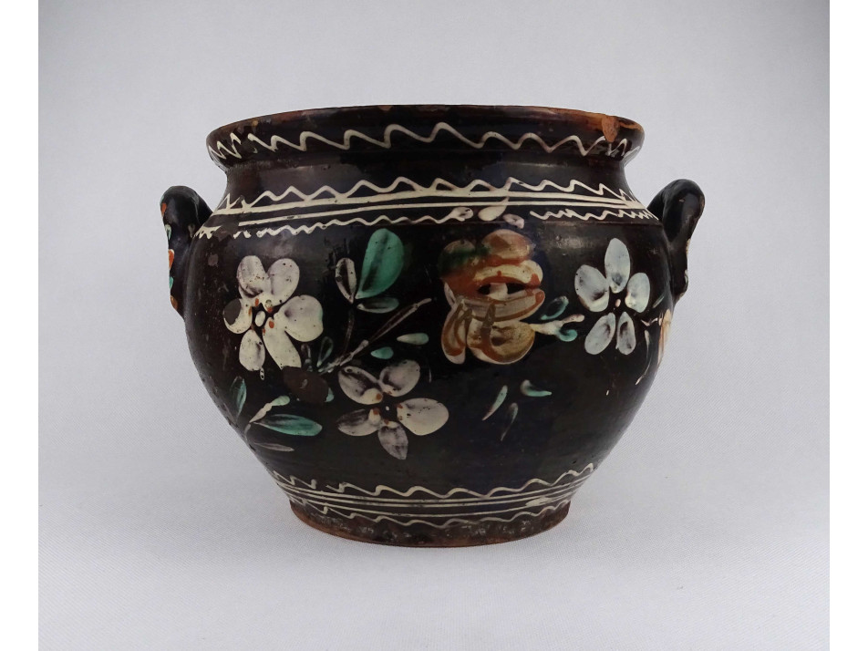 Antik, nagyméretű, szép állapotú, XIX. századi barna mázas, kézi festésű, füles, sárospataki cserép fazék.