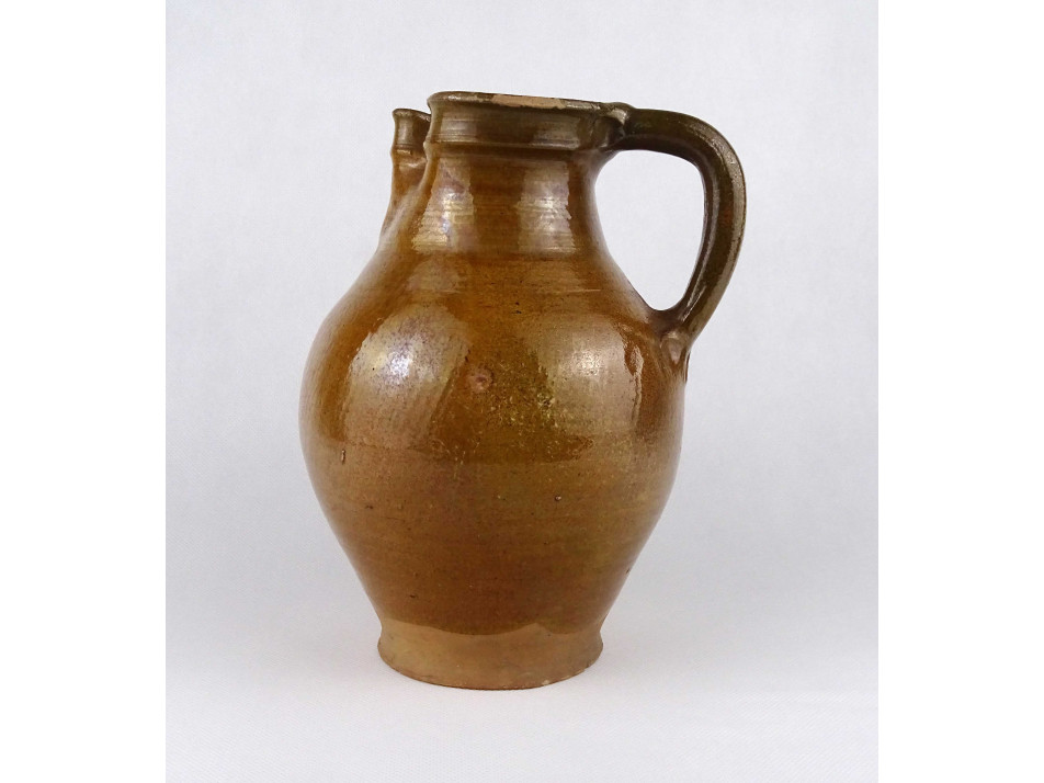 Régi, szép állapotú, egyfülű sárga mázas, belsejében mázatlan népi cserép korsó. Száján a kiöntőnél egy apró lepattanás található.