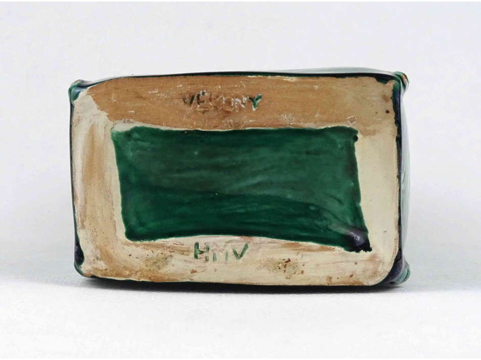 Régi, szép állapotú, jelzett, zöld mázas feliratos kerámia butella. A butellán néhány apró lepattanás található.