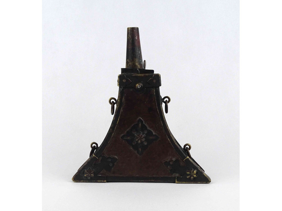 Antik, fából készült bőr bevonatú, réz pántokkal megerősített, veretekkel díszített lőportartó. Lőporos, elöltöltős fegyverekhez használt felporzó, szép állapotban az 1800-as évekből.