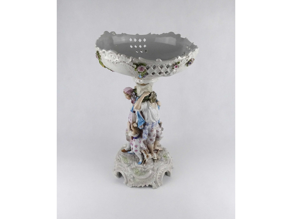Antik, 19. századi hatalmas méretű, négyalakos figuracsoporttal díszített Volkstedt Rudolstadt porcelán kínáló, asztalközép, gyümölcskosár. Sajnos a férfi figura feje eltört és több apró kis hiba, lepattanás található a kosár virágjain is. Ennek ellenére impozáns darab.
