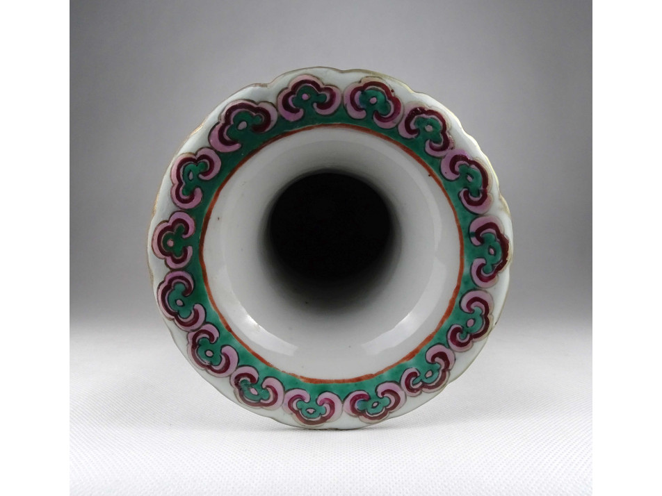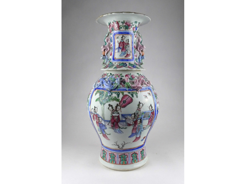 Antik, nagyméretű, plasztikus állatfigurákkal és kézi festéssel díszített, kínai porcelán díszváza, padló váza, oldalán sokalakos jelenetekkel és aprólékos virágmintákkal. Vastag porcelán, fajansz tárgy. A felső pereme szakszerűen javított, restaurált.