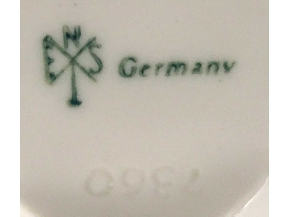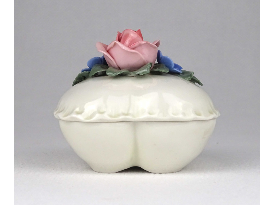 Hibátlan állapotú, barokkos formájú szív alakú, tetején rózsa fogantyús ENS porcelán bonbonier, ékszertartó. A rózsaszirmokon egy-két apró lepattanás található, alig észrevehető.