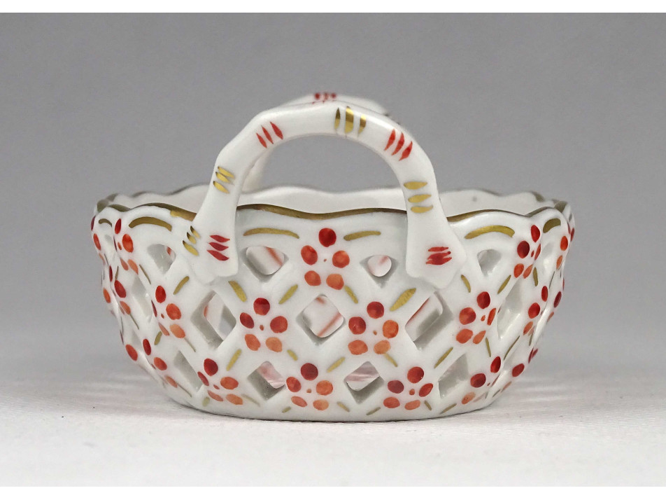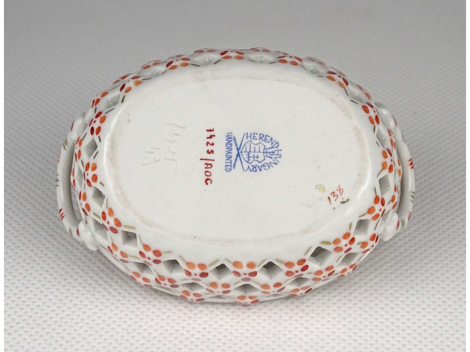 Régi, ovális alakú, kisméretű Herendi porcelán áttört gyűrűtartó kosárka. Rajta kézzel festett Apponyi mintás díszítés.