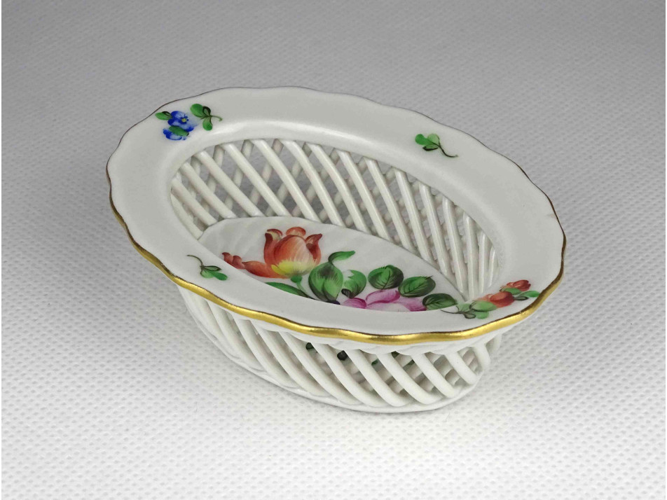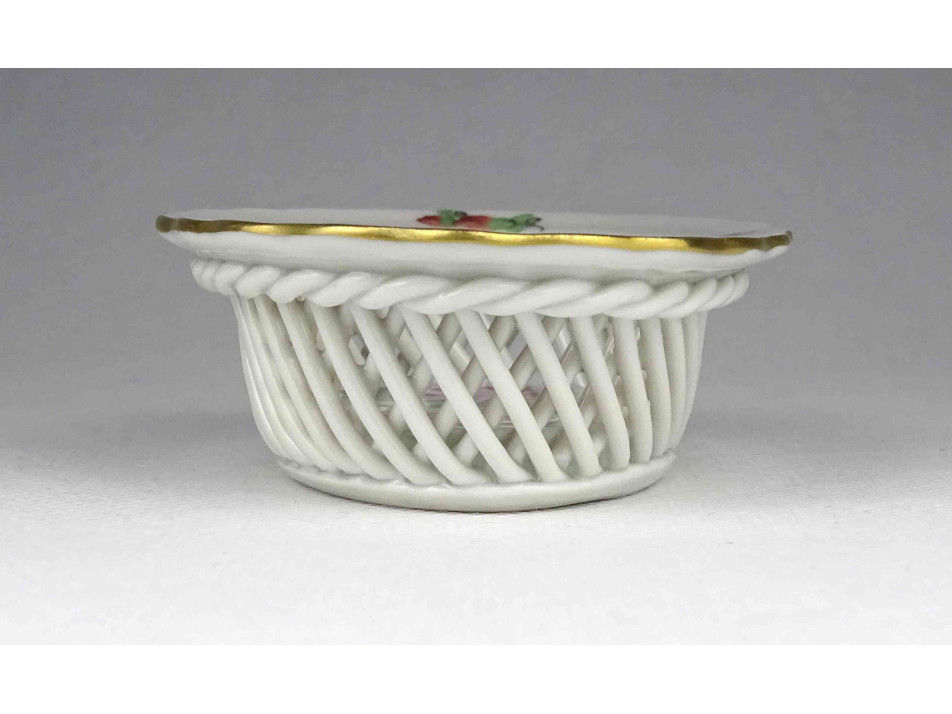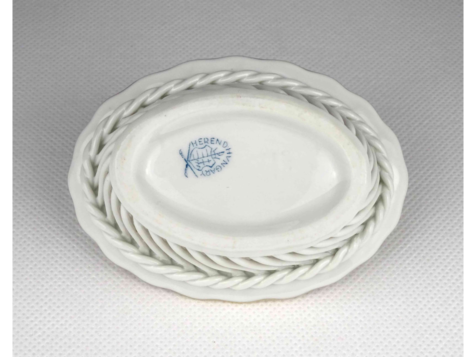 Régi, kisméretű, ovális alakú, virág mintás Herendi porcelán fonott kosárka.
