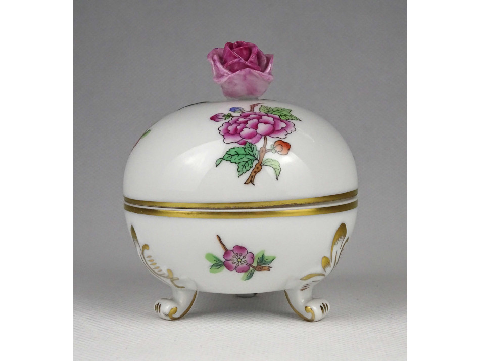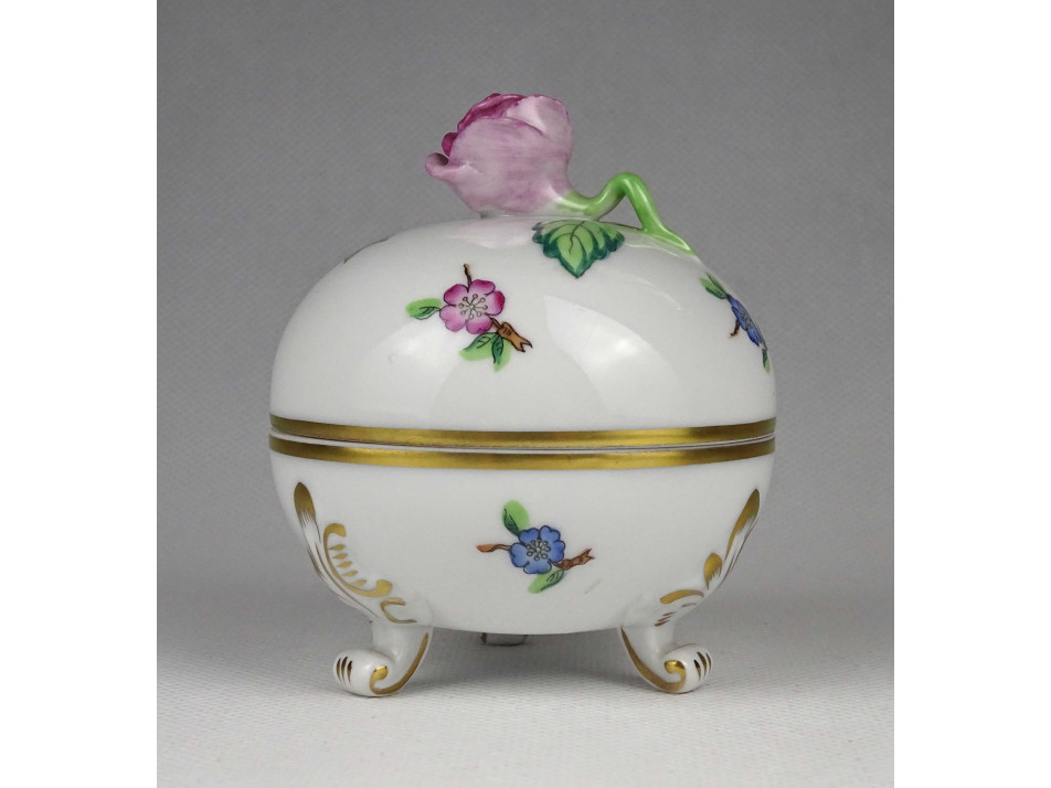 Hibátlan állapotú, három lábon álló, rózsa fogantyús, eton mintás Herendi porcelán bonbonier.