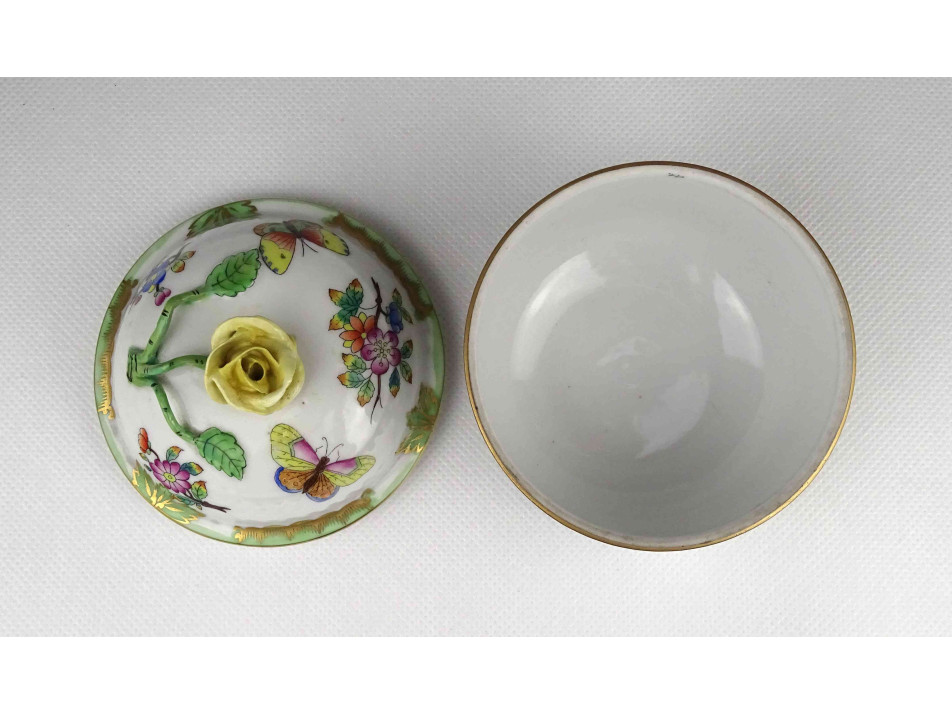 Antik, háború előtti jelzéssel ellátott, kézi festésű Viktória mintás, rózsás Herendi porcelán bonbonier. A rózsa-fogantyú restaurátor által szakszerűen javított.