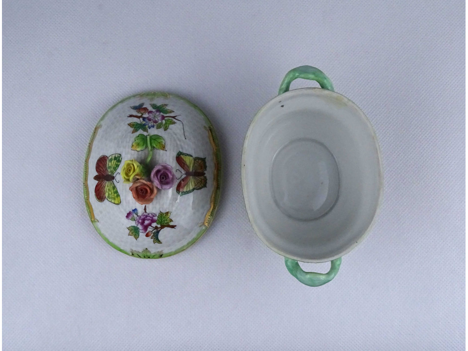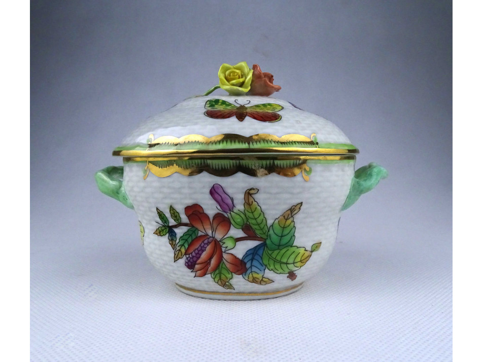 Régi, szép állapotú, Viktória mintás Herendi porcelán bonbonier, tetején hármas rózsa díszítéssel. Fülei restaurátor által szakszerűen javítottak.