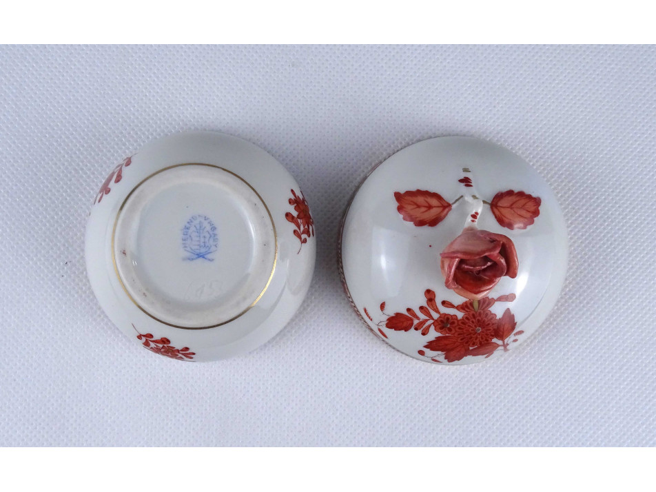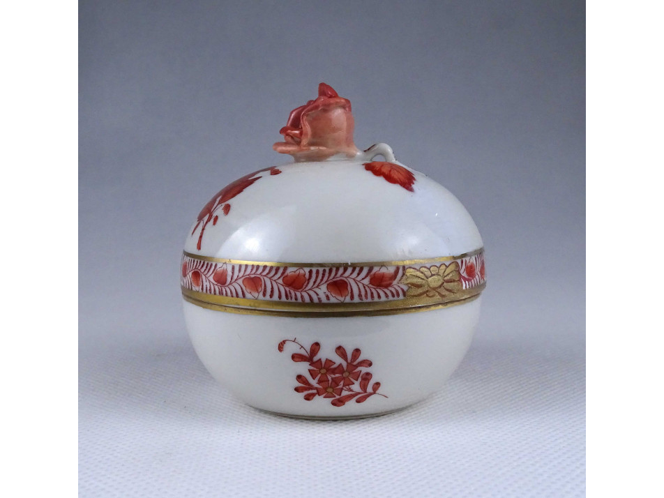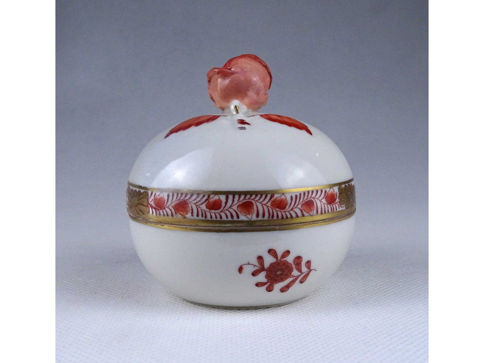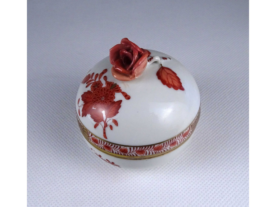 Régi, hibátlan állapotú, narancs színű Apponyi mintás, rózsás herendi bonbonier. A fedél pereme és a rózsa foggantyú restaurátor által szakszerűen javított.