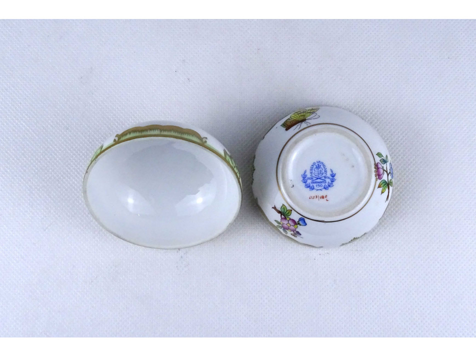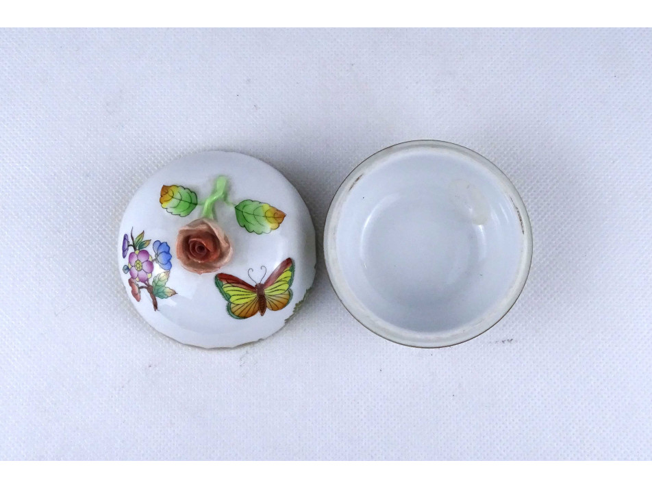 Régi, hibátlan állapotú, Viktória mintás Herendi porcelán ékszertartó bonbonier, fedelén plasztikus rózsa fogantyúval.