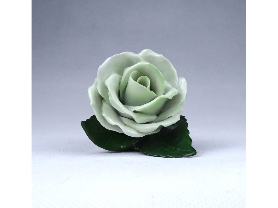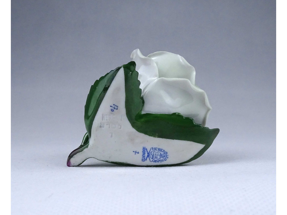 Régi, hibátlan állapotú, halványzöld Herendi porcelán rózsa. Az egyik levél széle restaurátor által szakszerűen javított.