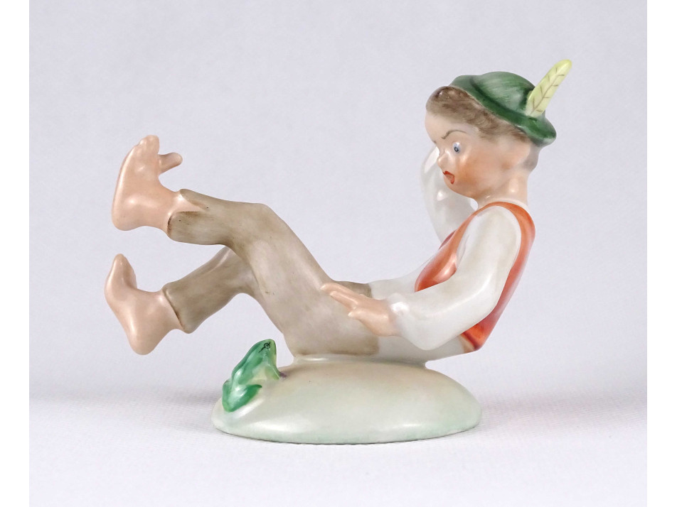 Régi, hibátlan állapotú, kézi festéssel díszített Herendi porcelán figura, tollas kalapos ijedt fiú békával.