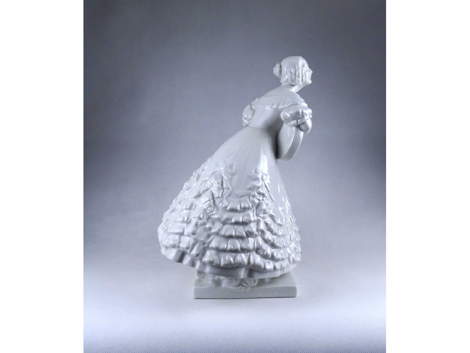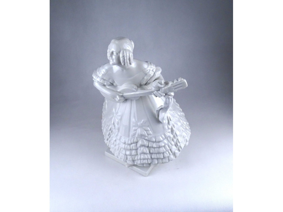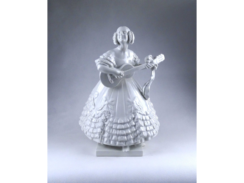 Hibátlan állapotú, nagyméretű, festetlen óherendi porcelán figura, talapzaton álló, gitározó Déryné szobor. A gitárról lógó szalag restaurátor által szakszerűen javított.