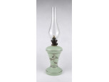 Régi halványzöld kézzel festett fújt üveg petróleumlámpa cilinderrel 42.5 cm
