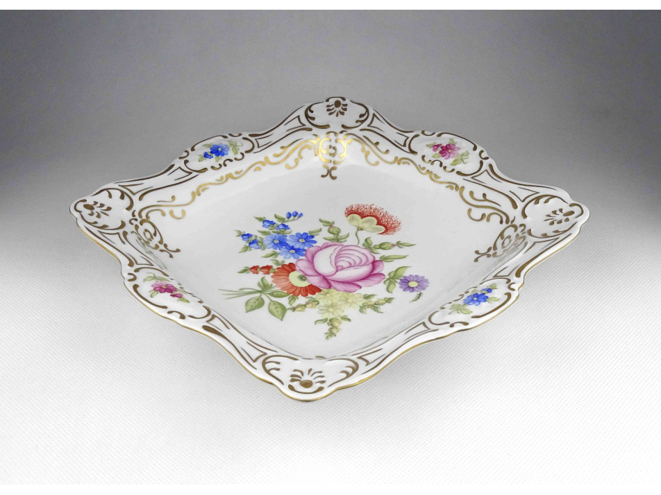 Hibátlan állapotú, gazdagon aranyozott, kézi festéssel díszített, négyszög alakú, Hollóházi porcelán asztalközép, kínáló tál, gyümölcskínáló. Aranyozása kopásmentes, ajándékba adható!
