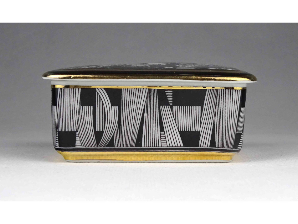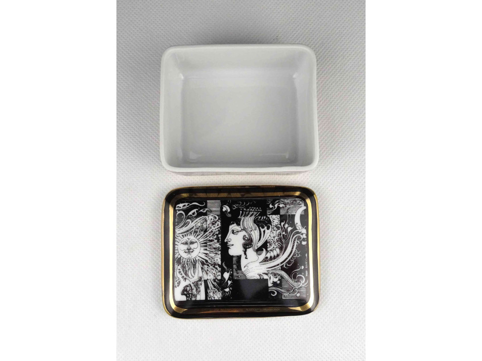 Hibátlan állapotú porcelán bonbonier. Fedelén és körben Szász Endre által készített motívumok láthatók. A bonbonier fedelén Szász Endre szignó található.